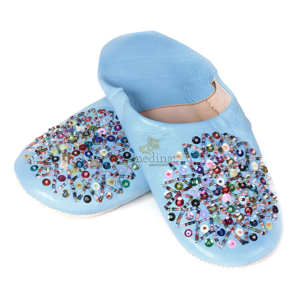 Craquez pour la plus agréable des babouches femme : les babouches Essaouira bleu ciel ! Chaussez en toute facilité cette paire de babouche marocaine en cuir véritable et portez-les tout au long de la journée sans craindre d’être épuisé grâce à leur excellent confort de port. Ces babouches marocaines disposent de semelles en cuir très résistantes. La décoration perles et paillettes par-dessus ces babouches femmes bleu ciel forme un produit tout simplement rayonnant et séduisant.