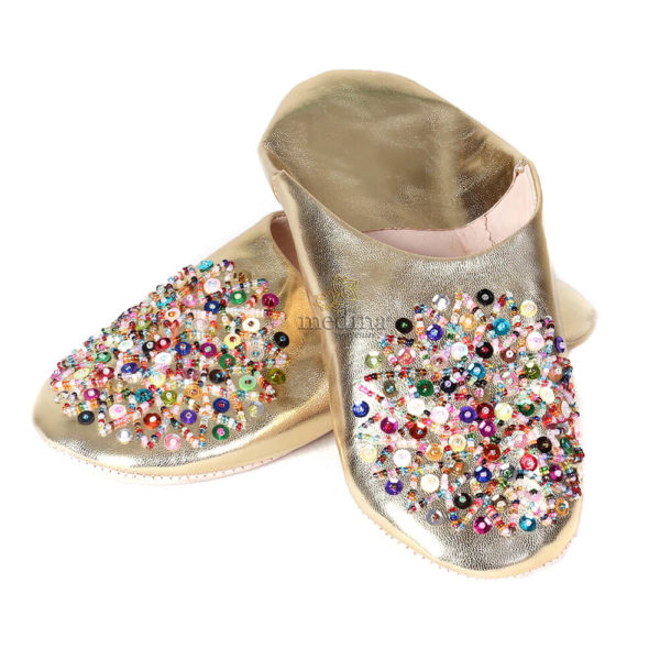 Éclairez vos journées avec cette paire de babouche paillettes pour femme! Des babouches Femme modèle Essaouira or à porter en mocassins de maison pour des moments de légèreté et d’élégance. Fournies ici à bout rond, ces babouches pour femme sont ornementées de perles et paillettes multicolores, dans la plus pure tradition de l’artisanat marocain.
