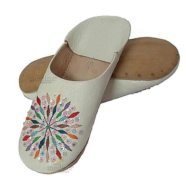 Babouches en cuir à paillettes et broderies de soie, babouche rafia blanche