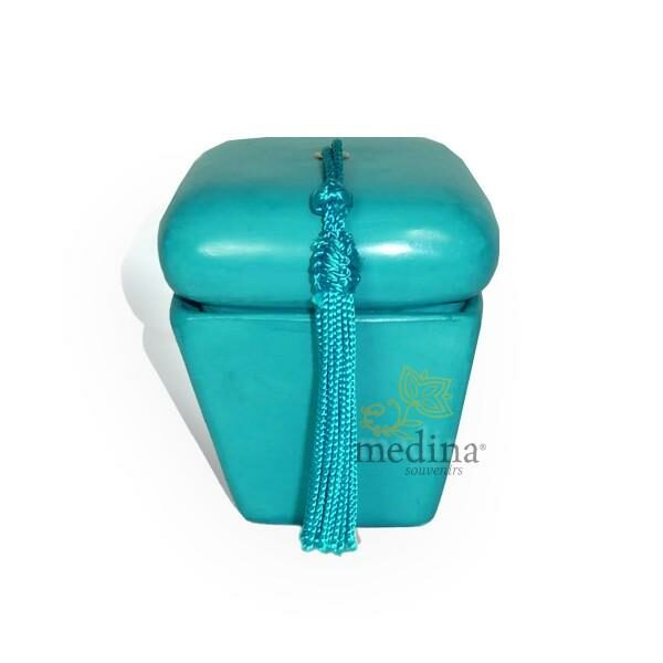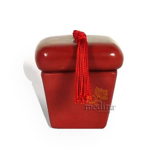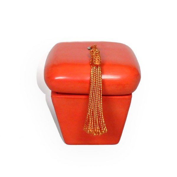 Boite hexaèdre en forme de pyramide, en tadelakt, avec pompon en soie de sabra.
