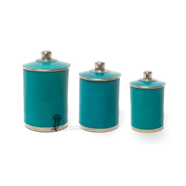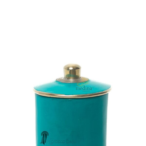 Boite tadelakt Chadya de couleur turquoise vous permettant de vous en servir de manière décorative ou encore de les laisser dans votre cuisine pour les remplir d’épices, de bonbons ou encore de petits objets.
