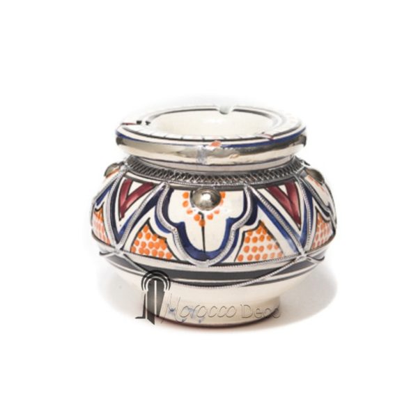 Ravissant cendrier marocain blanc, orange et vert fait main cerclé de métal poli et de fils torsadés. Un chef d’œuvre purement artisanal fait par les mains expertes des artisans en poterie marocaine pour sublimer votre intérieur ou votre terrasse de jardin.